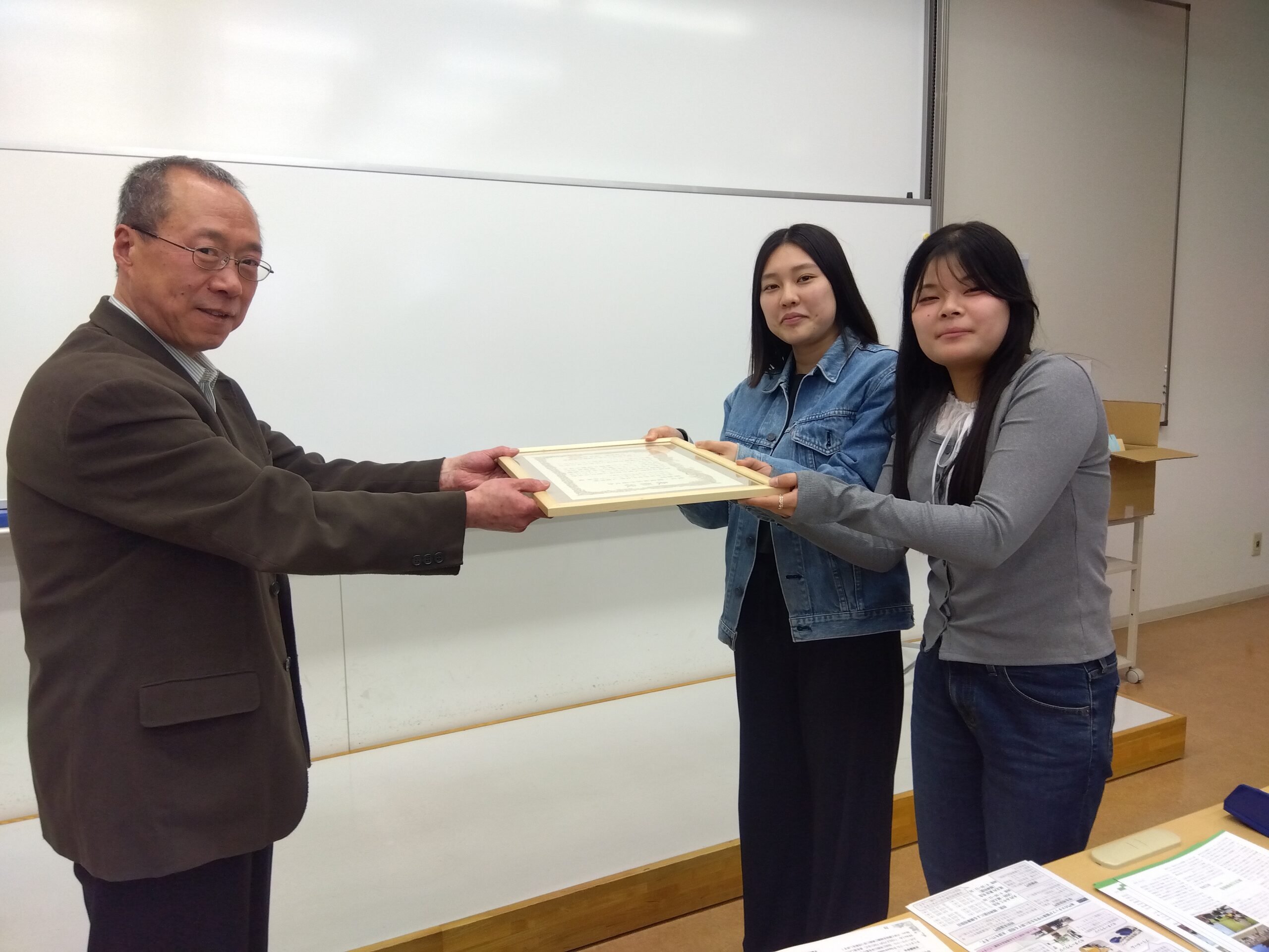 4月1日(火)の新4年生ガイダンスで、門間結希さんと早坂和香那さん(グローバル・スタディーズ学科小形ゼミ4年)に「2025年度社会人基礎力育成グランプリ北海道・東北地区予選大会」で受賞した奨励賞の賞状が、4年アドバイザーの賈先生から手渡されました。