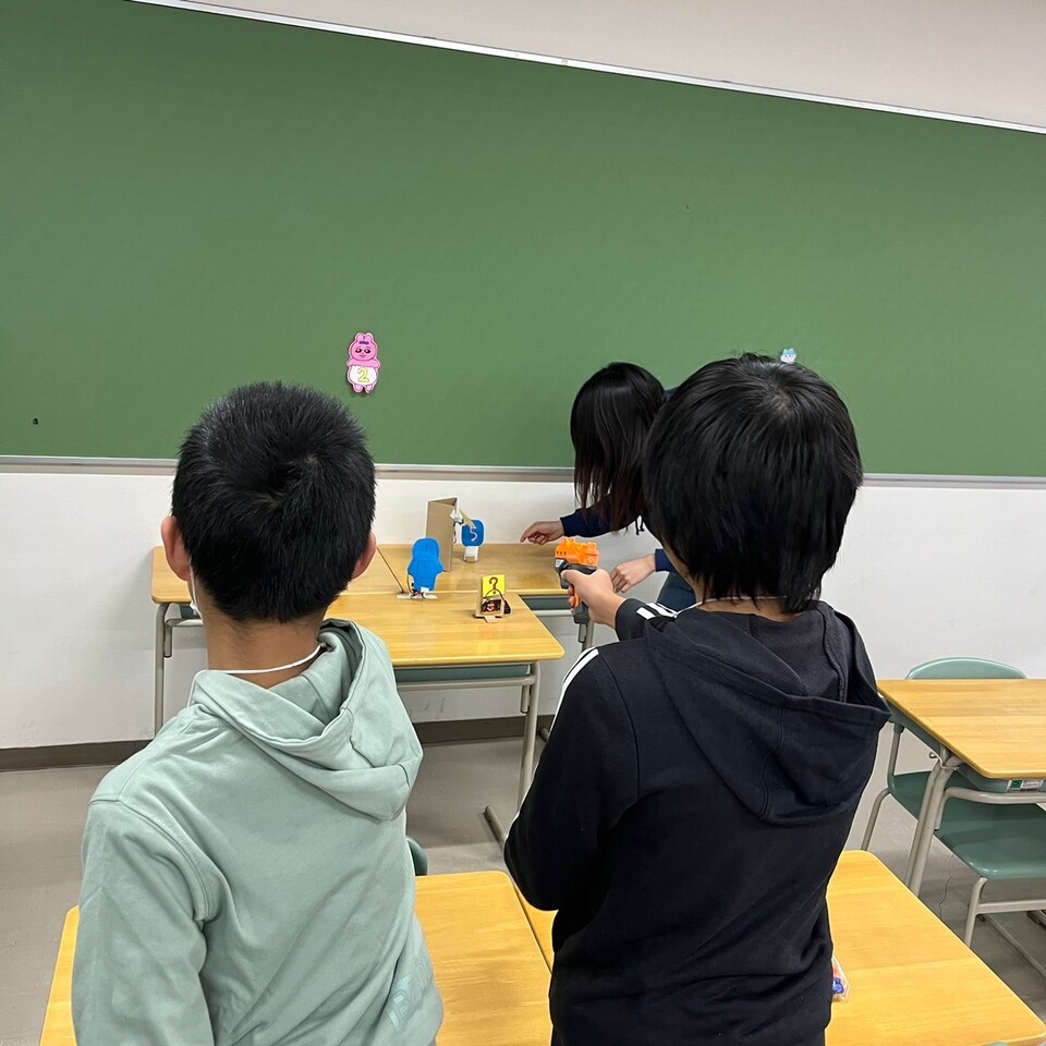 作品が完成すると、子ども達は自分で作ったイライラゲームで遊んだり、ギターにオリジナルのデコレーションをしたり、好きなデザインを施した的を机の上に配置し、みんなでおもちゃの銃を使って射的ゲームをして遊びました。子ども達が夢中になって取り組む様子は、私たちにとっても大変心温まる光景でした。