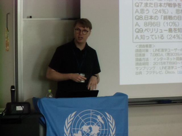 模擬授業は「国際関係論・政治学」が専門のマスロ―先生で、テーマは「戦争をどう伝えるか」でした。