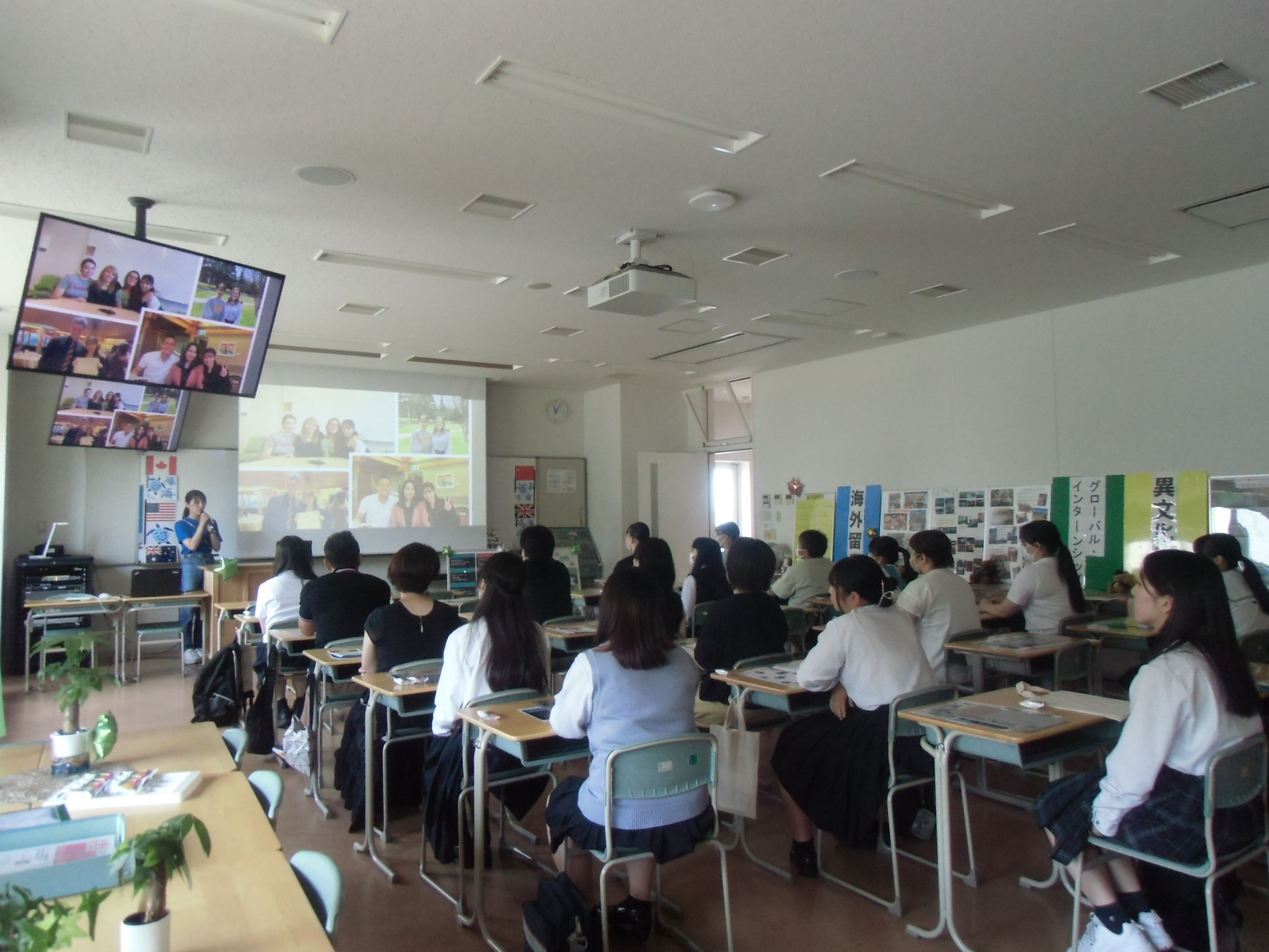 本学科では、学科紹介の他、留学体験や今、韓国に留学中の学生にオンラインで体験を報告してもらいました。