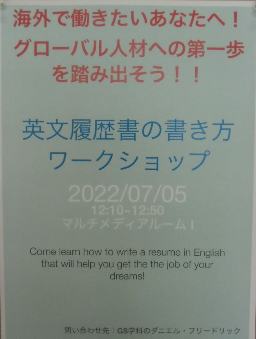 7月5日(火)、ダニエル・フリードリック先生による「英文履歴書の書き方ワークショップ」が行われました。海外の企業が採用したいと思うようなインパクトのある履歴書作成のポイントについて教えていただきました。
