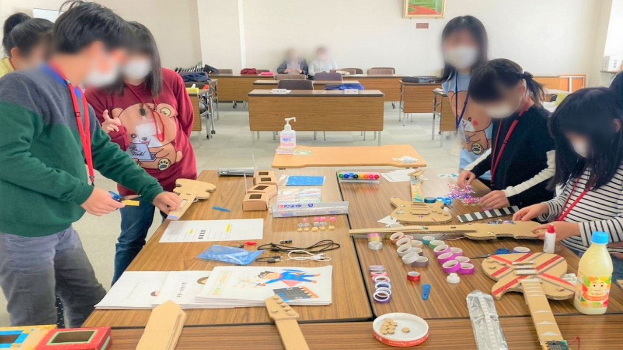 第1回(10月29日)と第3回(12月3日)は小型のマイコンボードmicro:bitとダンボールを組み合わせた電子工作(光る剣・シーソーギター・ヴァイオリン作り)を、第2回(11月5日)はクルマ型ロボットとドローンを操作するプログラミングを行いました。プログラミングはうまくいかないことの方が多く、失敗してもめげずに何度も繰り返し挑戦することが大切です。そして最後にうまくできた時には何事にも代えがたい充実感や達成感が待っています。今回のワークショップでも、子どもたちは真剣な眼差しでプログラミングに取り組み、難しいタスクも粘り強くやり遂げ、子どもたちが満面の笑みを浮かべて喜ぶ姿をたくさん見ることができました。ご参加いただいた小学生の皆様、ありがとうございました。