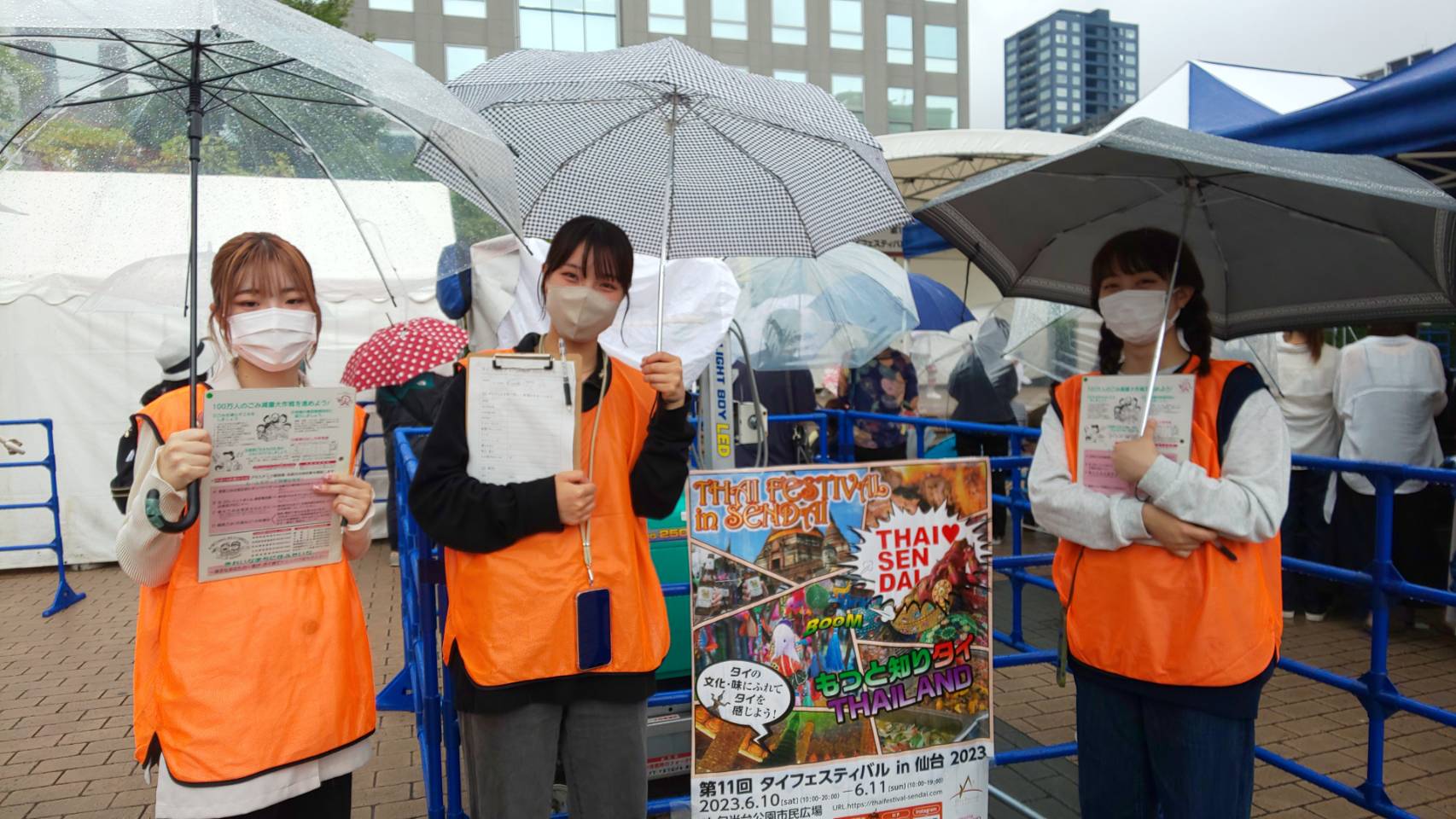 6月10日(土)と11日(日)に勾当台公園市民広場で開催された「タイフェスティバルin仙台 2023」にグローバル・スタディーズ学科の学生24名がボランティアで参加しました。タイの文化に触れ、また、他大学の学生とも交流でき、充実したひとときを過ごせたようです。11日(日)に参加した2年の大場杏乃さんが体験談を寄せてくれましたので、ご紹介します。